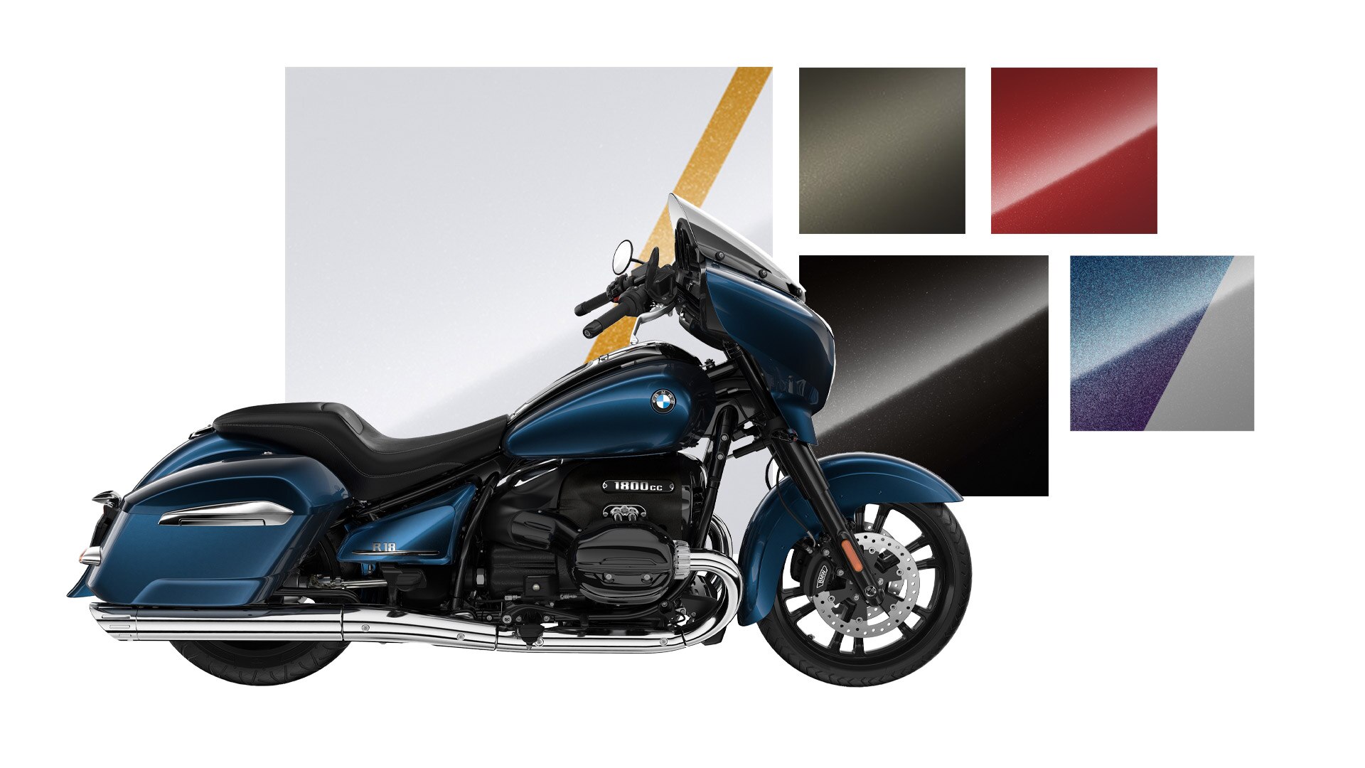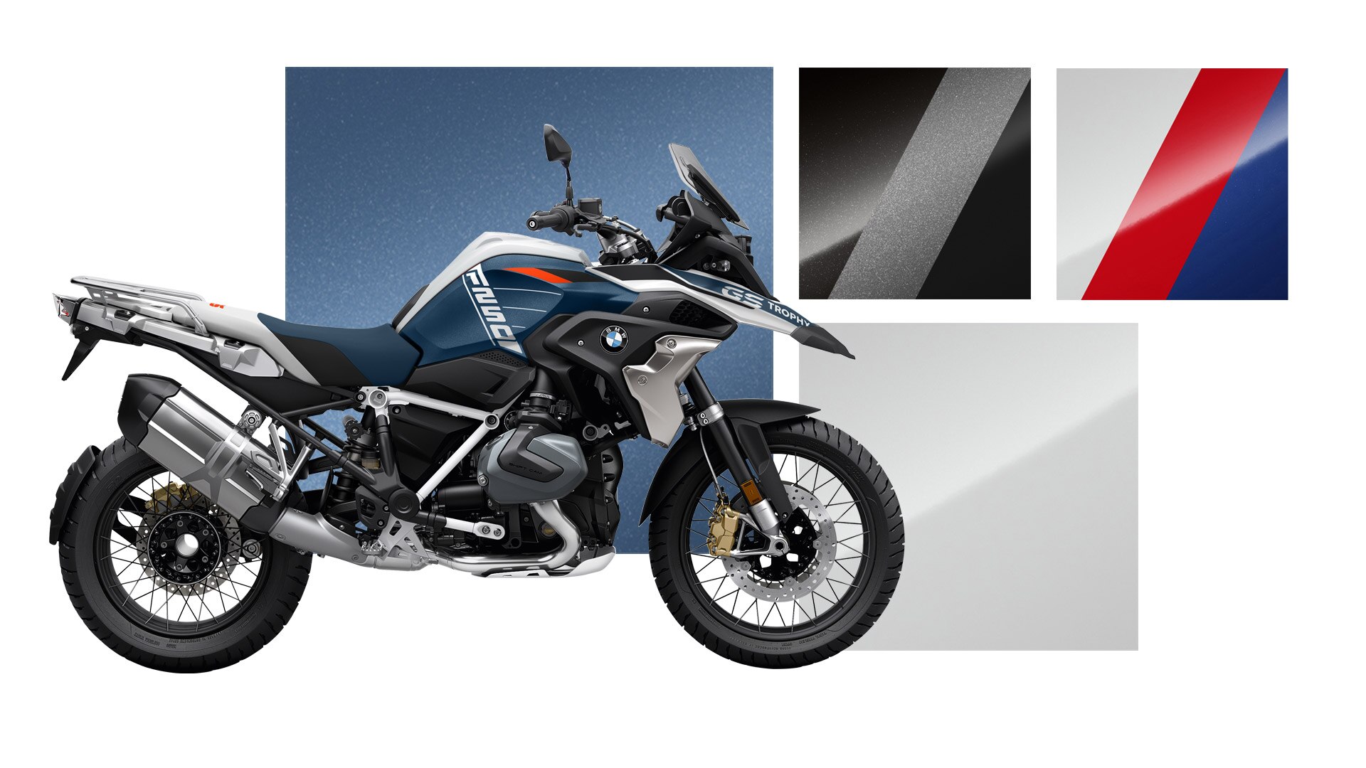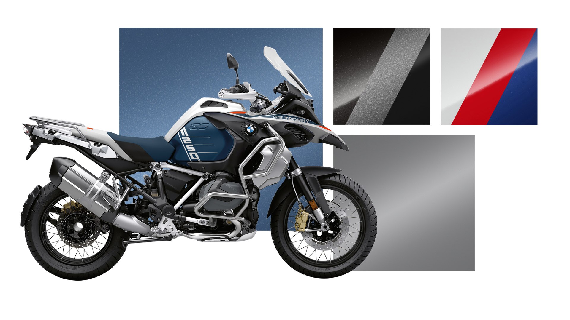 L’Option 719 Mineral white metallic met l’accent sur les grandes surfaces de la moto et souligne son allure élégante. Les touches dorées accentuent avec précision les points forts des motos. Harmonieuse, équilibrée, attrayante : la couleur Gravity blue metallic confère à la moto une véritable impression de grandeur et de souveraineté.