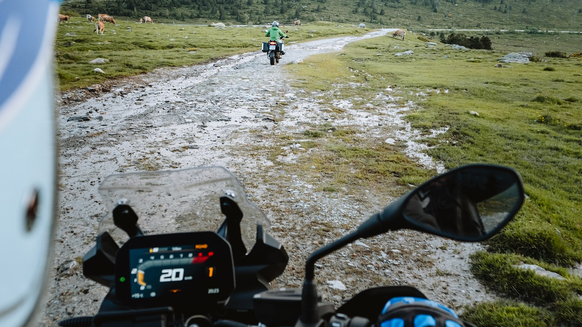 « De nombreux chemins de terre s’en échappaient, terrain de jeu parfait pour nos montures et plus particulièrement pour Kevin, qui a vraiment pu prendre la mesure de sa F 850 GS en situation d’enduro. Au milieu des vaches, nous avons monté le camp dans l’herbe grasse pour y passer la nuit. »