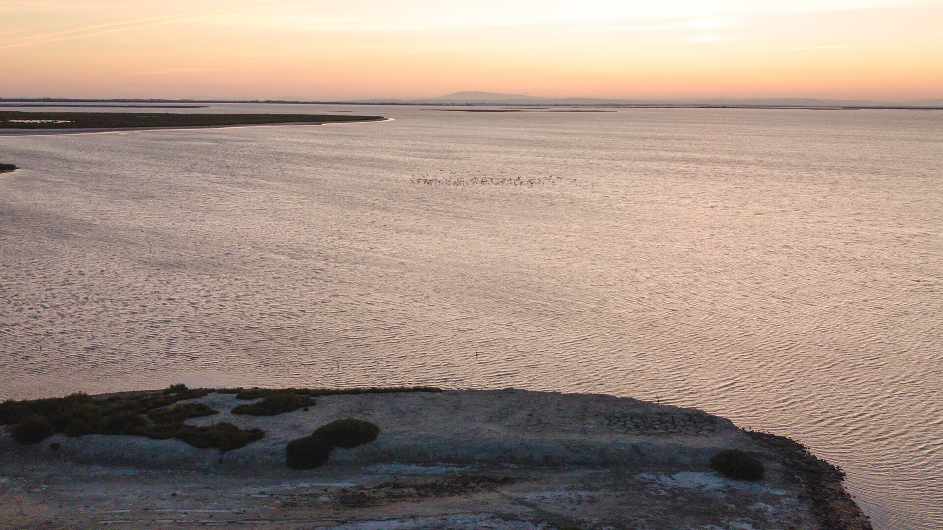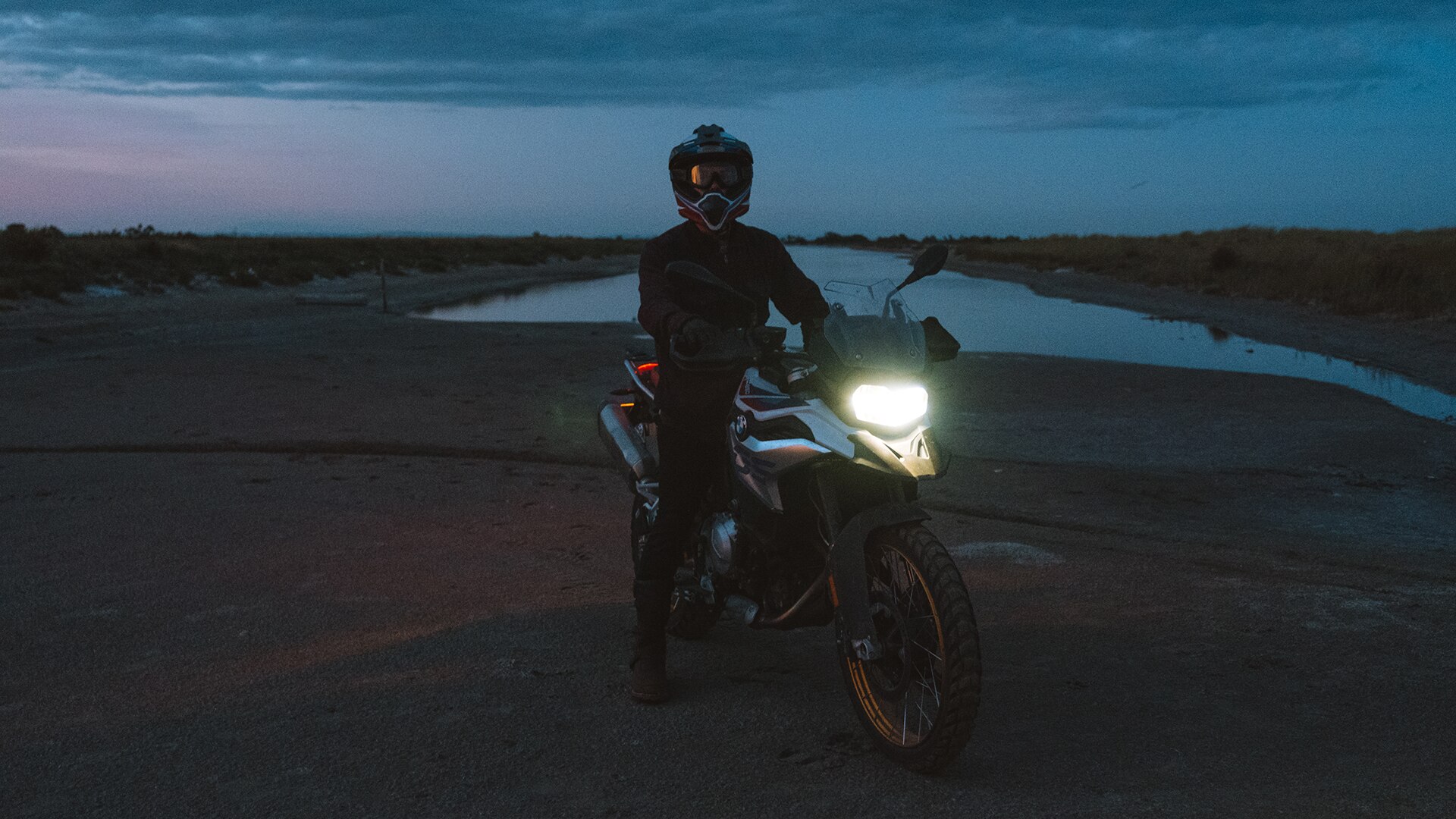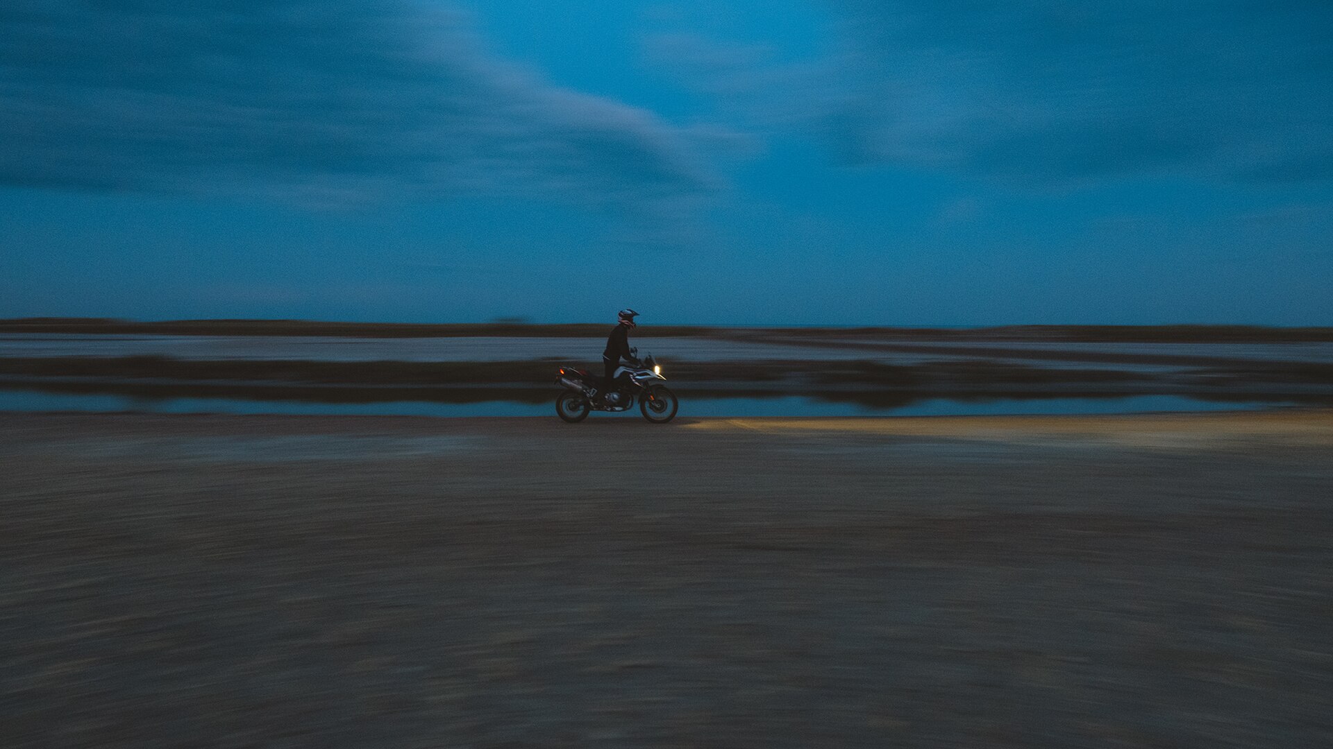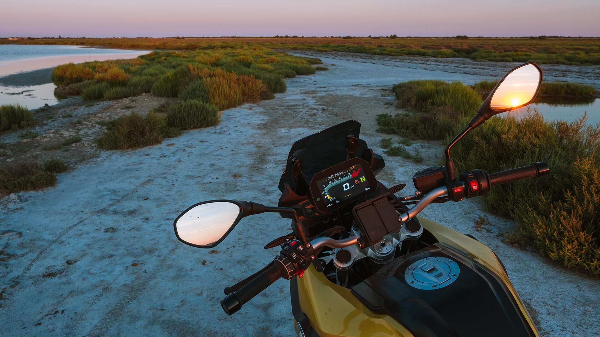 « Encore une fois, nous arrivons tout juste après que le soleil soit couché. Nous n’allions pour autant pas céder à la déception d’avoir raté les vols des flamants roses dans les reflets dorés du soleil couchant. Les bancs de sable interminables qui séparent entre eux les marais de Camargue s’avèrent être un pur régal à chaque tour de roue. Nous étions comme largués dans une dimension parallèle, à l’horizontale parfaite, quelque part où ciel et terre ne font plus qu’un. »