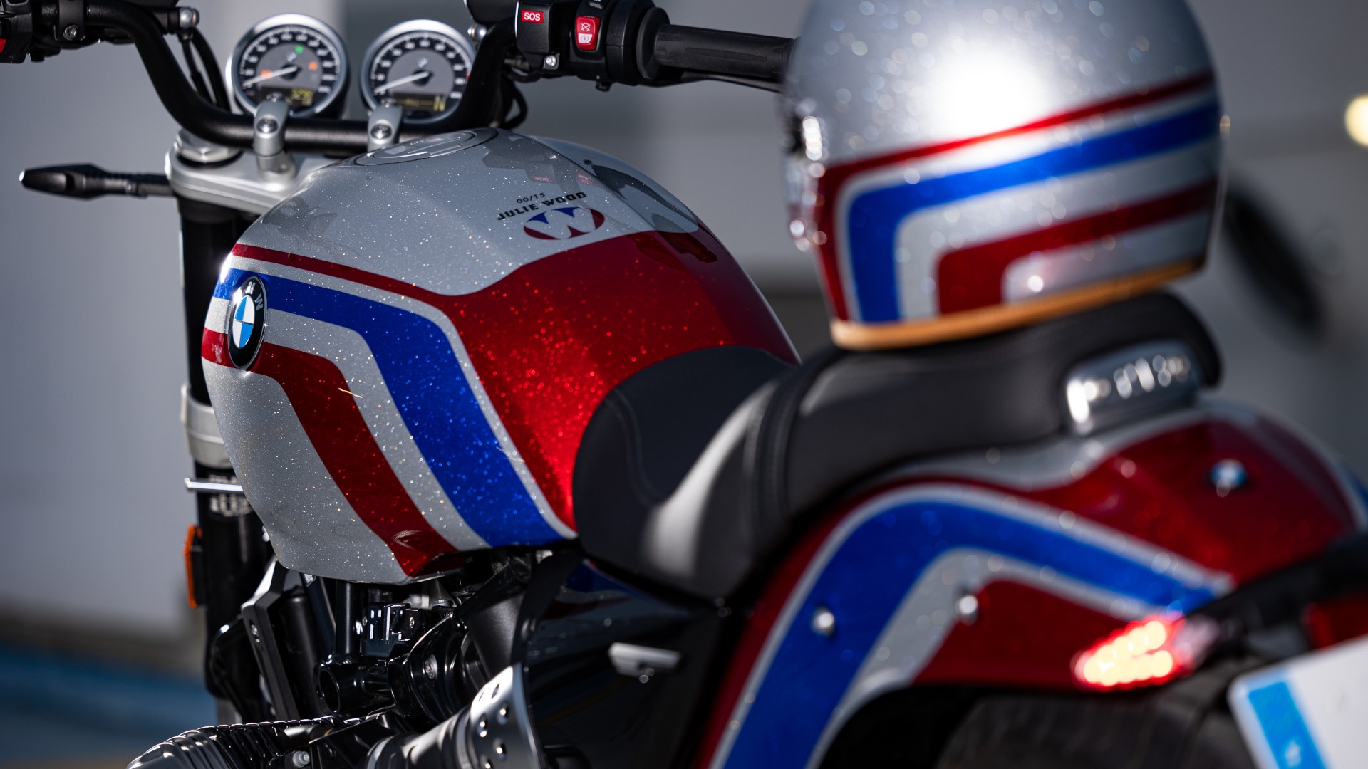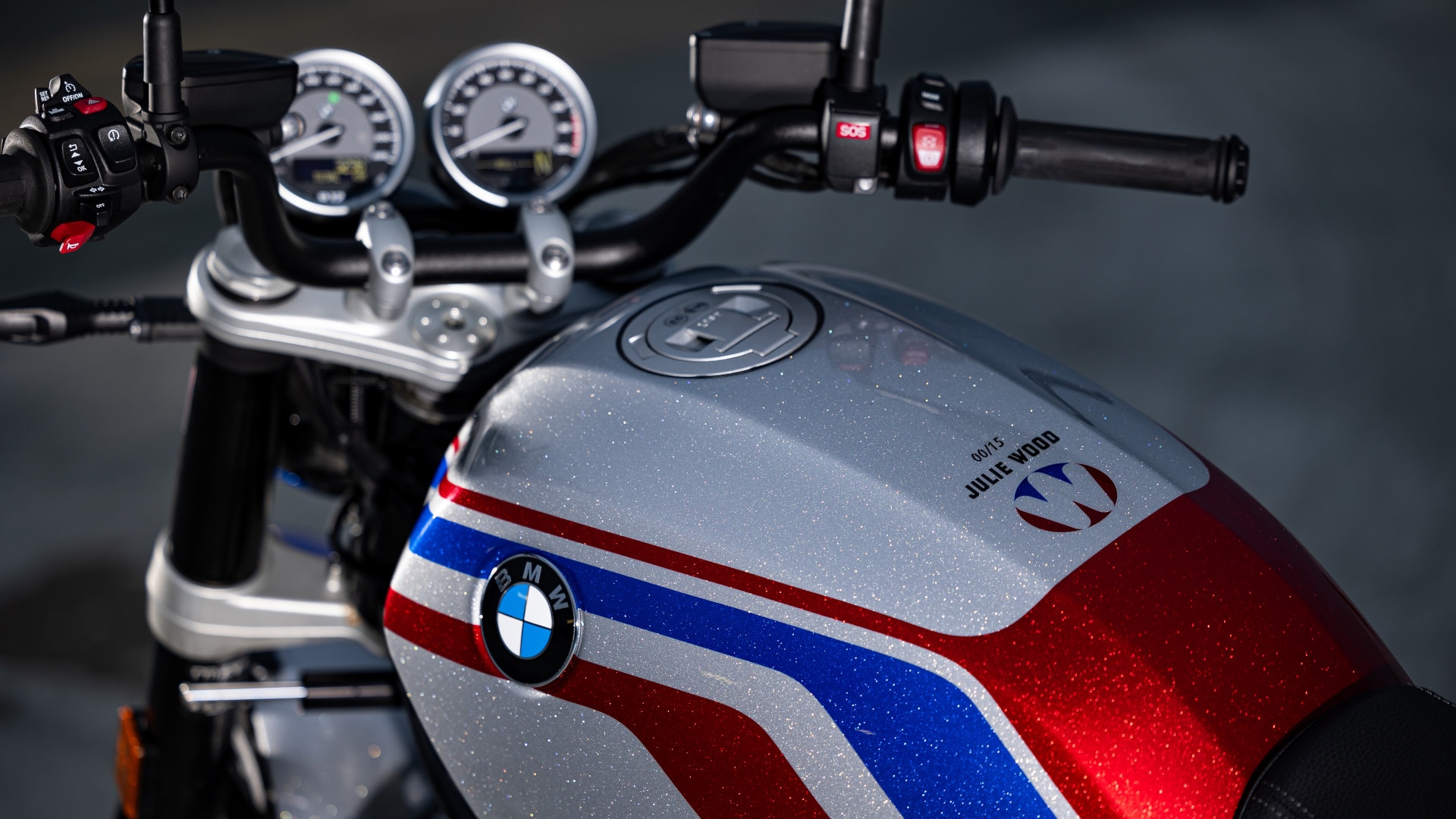 Nous tenions à marquer l'événement avec une série spéciale : la BMW R 12 Julie Wood. Une préparation aux coloris uniques, dotée d’un équipement complet : Finition PRO (Pack Confort, alarme antivol, feux de route Pro et capteur de pression des pneumatiques RDC), kit passager, échappement design, roues noires à rayons Option 719 Classic de 19’’ à l’avant et 16’’ à l’arrière, compte-tours analogique (qui vient compléter le cadran d'instrumentation analogique de série).